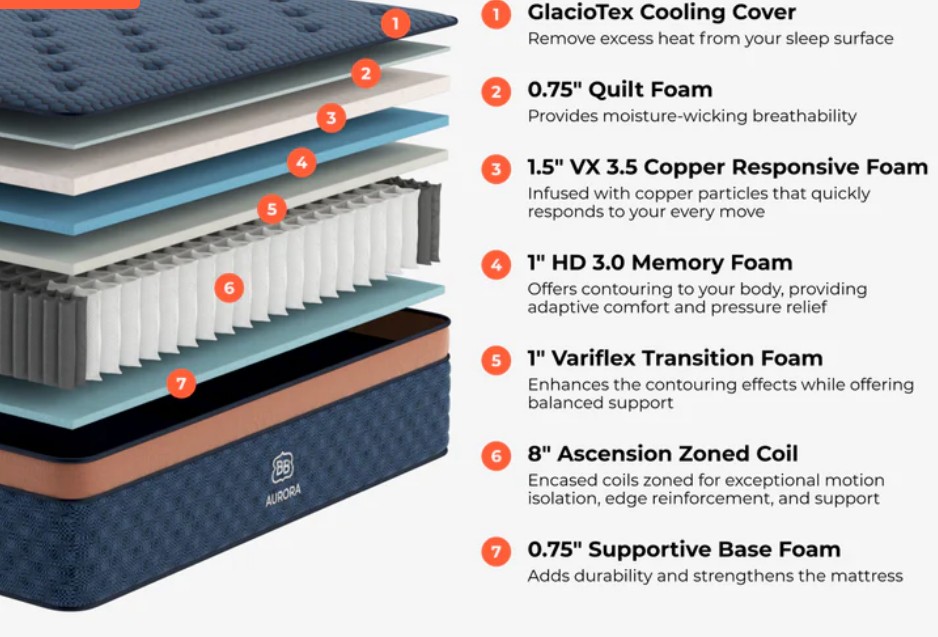 Looked at every brand under the sun. No brand had all the features I was looking for except the BB Aurora Luxe with the cooling pillow top. Had features that even more expensive brands were lacking. Side sleeper, over 6ft over 250. 30 days in. Thrilled with this purchase. Wanted to regret spending a bunch of money on a mattress. I don’t. At all